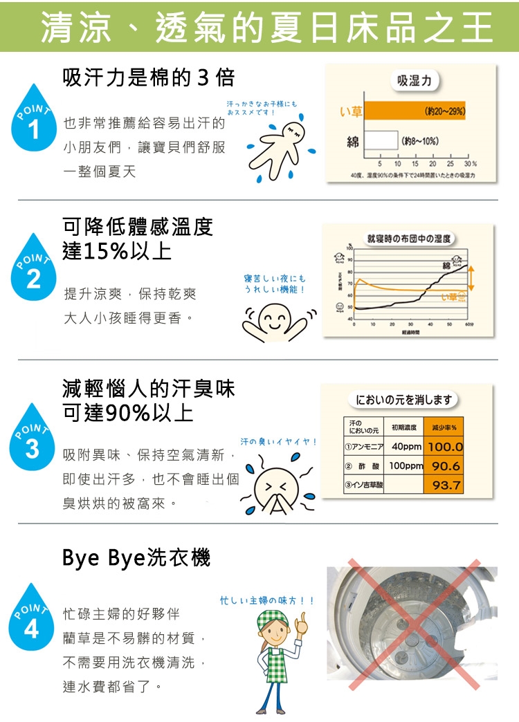 藺草能吸收空氣的水分,保持空氣濕度平衡。藺草可以在睡眠期間吸收相當棉質床單枕套2.5倍的汗液,保持乾爽,促進睡眠。