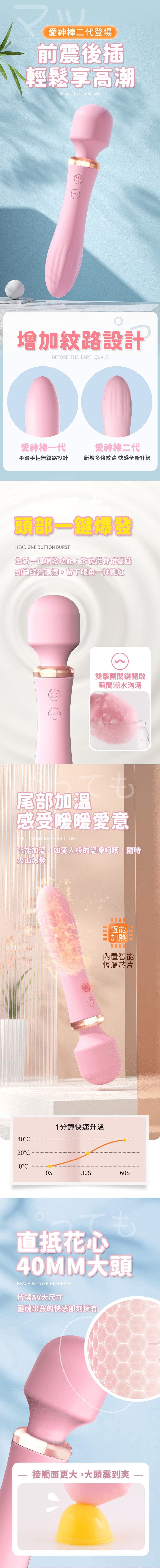 功能:雙頭震動(10段變頻)、頭部一鍵爆、尾部可加溫