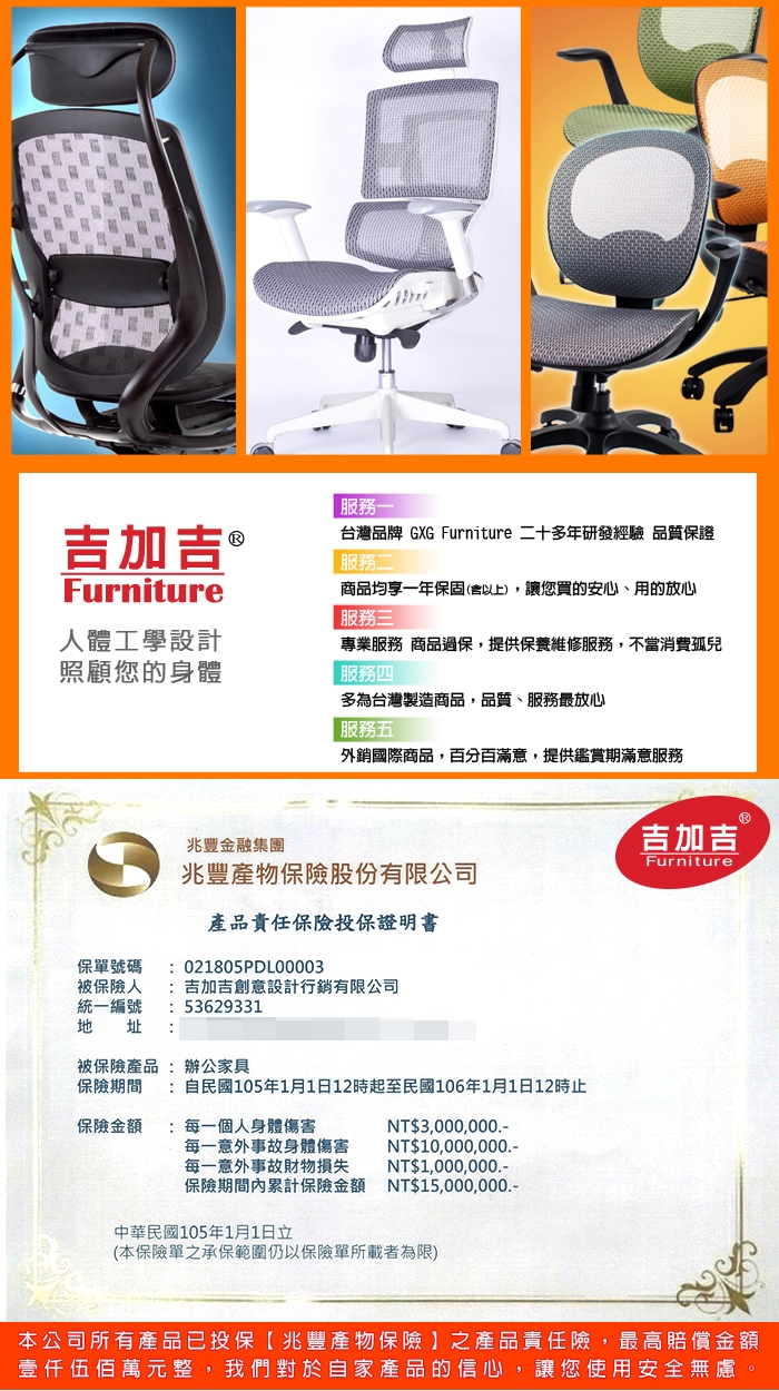 6.『吉加吉家具』所有產品已投【兆豐產物保險】之產品責任保險最高賠償金額新台幣壹仟伍佰萬元整,我們對於自家產品的信心,讓您使用安全無慮,請安心購買。