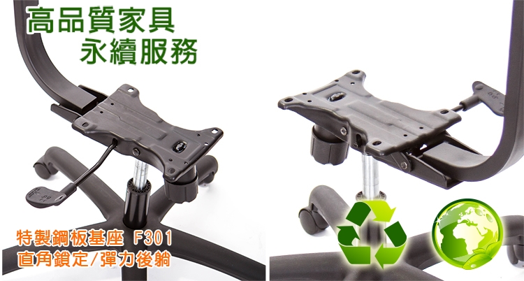本款坐墊底盤使用F302分離式鋼板基座,可四段後躺固定,依自己喜好故定角度,或不固定隨時可彈力後躺雙功能;懸臂機構在後躺時,座墊會同步傾斜,重心平穩,防止翻倒。
