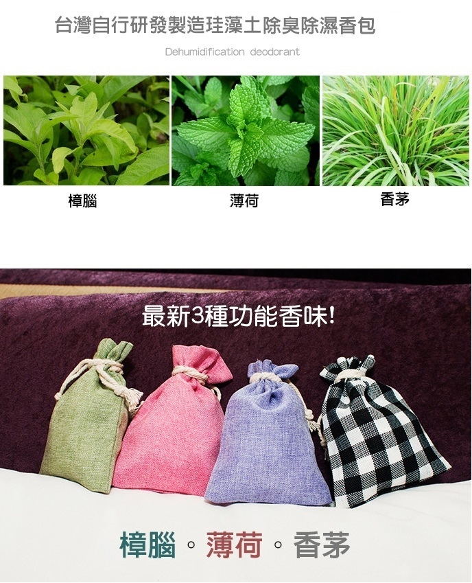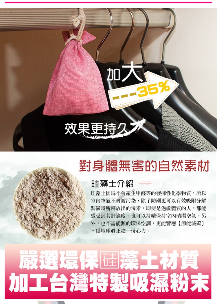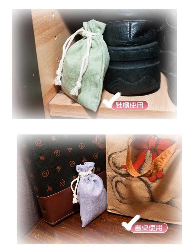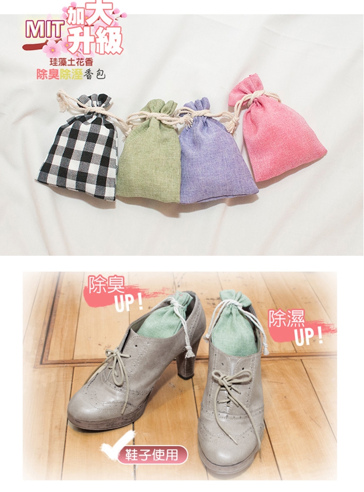 台灣製造SGS加大款珪藻土花香除臭除濕香包,尺寸加大、重量升級!嚴選環保珪藻土材質加工特製吸濕粉末,吸水性強,除濕除臭防霉!更添加天然香氛精油,清新的花草香氛宜人,除臭又芳香!外袋使用簡約素面麻布束袋,不僅美觀,棉繩可掛設計也方便實用唷!