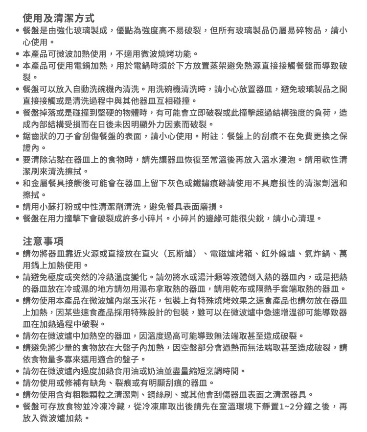 ※康寧餐具可以放入自動洗碗機內清洗,用洗碗機清洗時請小心安置餐具,避免玻璃製品之間直接接觸或是清洗過程中與其他器皿互相碰撞。