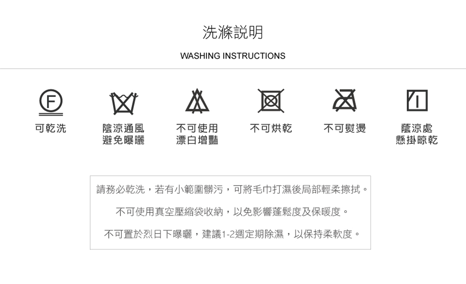 ► 再度使用前,請放陰涼處通風半天以上,恢復蓬鬆柔軟度。
