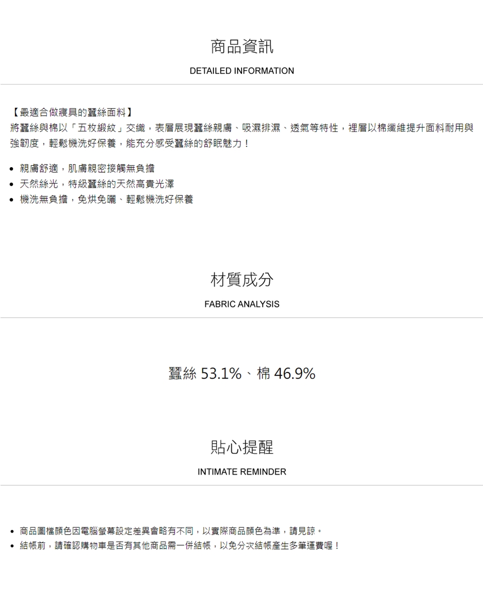 ► 避免放置樟腦丸於被內。避免重壓或用真空收縮袋收納,維持蠶絲內胎結構及蓬鬆度。