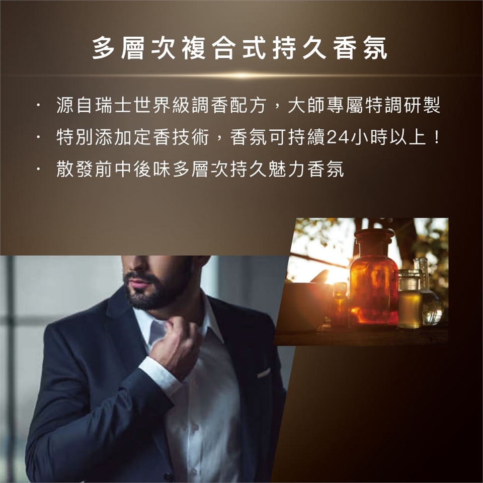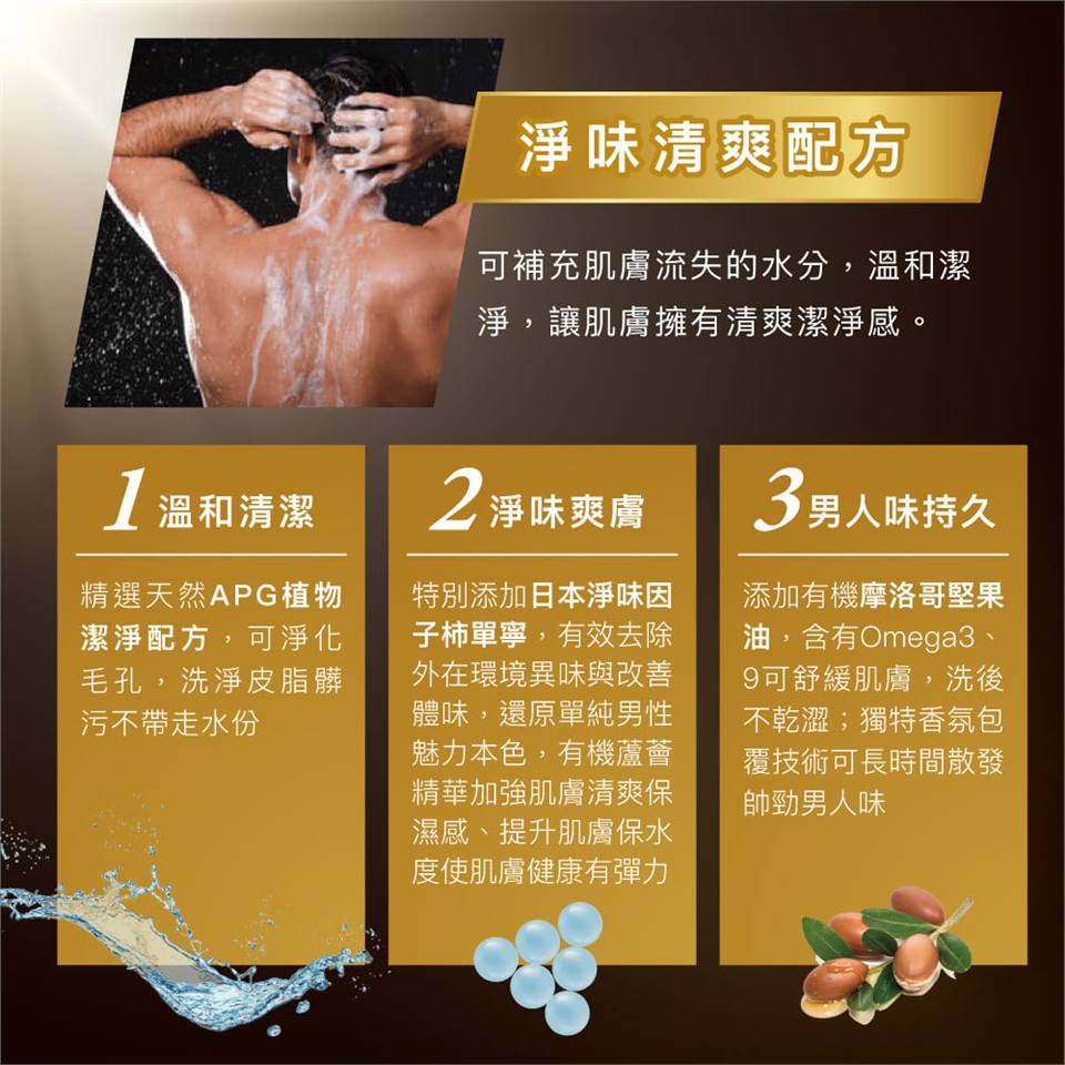 第三重<男人味持久>: 添加有機摩洛哥堅果油,含有Omega3、9可舒緩肌膚,洗後不乾澀;獨特香氛包覆技術可長時間散發帥勁男人味