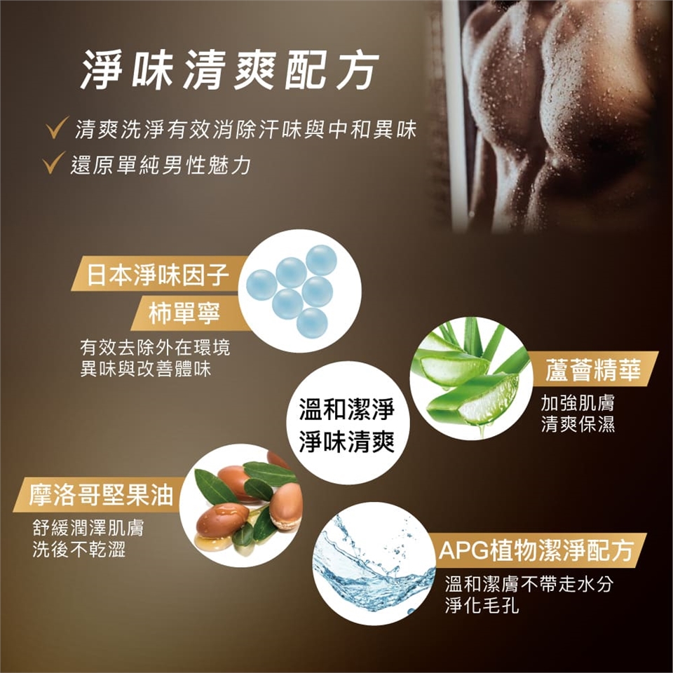 <男人味持久>: 添加有機摩洛哥堅果油,含有Omega3、9可舒緩肌膚,洗後不乾澀;獨特香氛包覆技術可長時間散發帥勁男人味