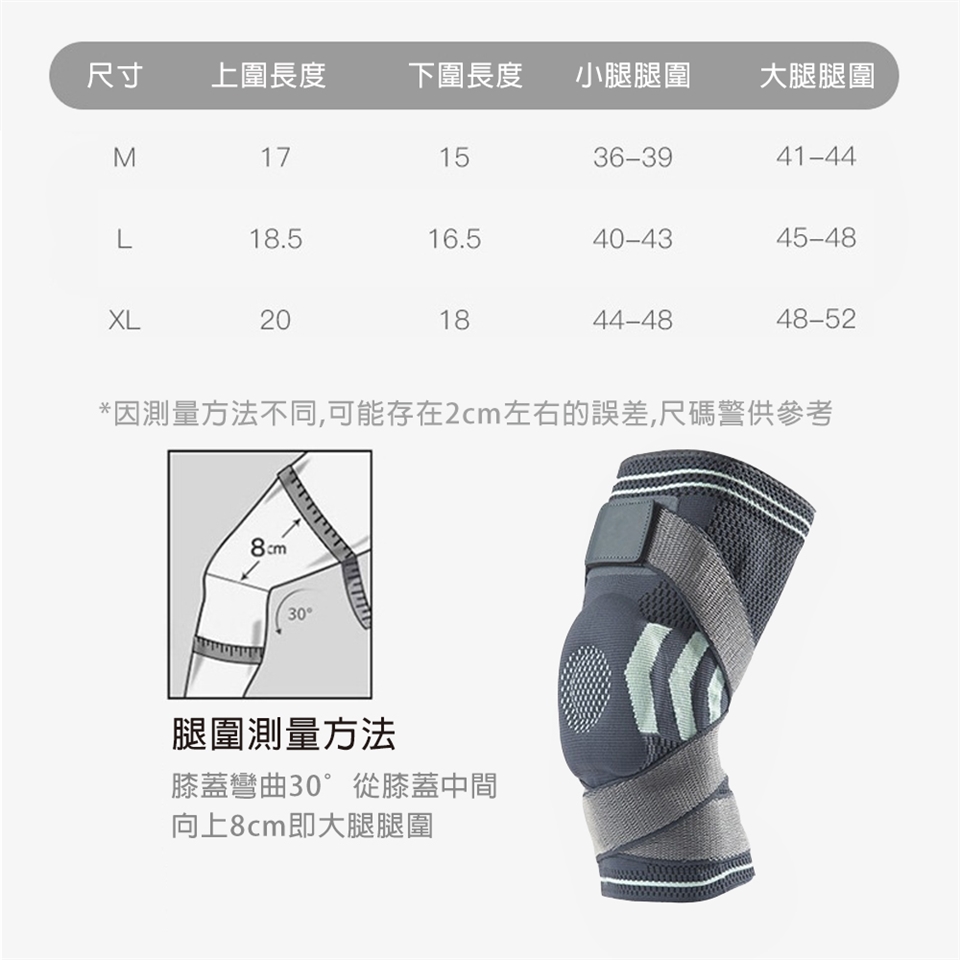 如圖所示,套至膝蓋部位,將牽引綁帶調整至個人舒適位置再黏貼魔鬼氈使其固定
