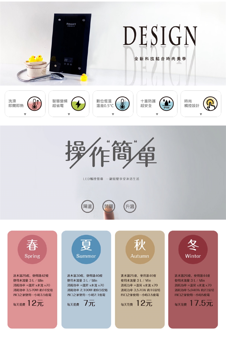 設定溫度30-60度(需搭配水流量調整),自動調整適當功率
