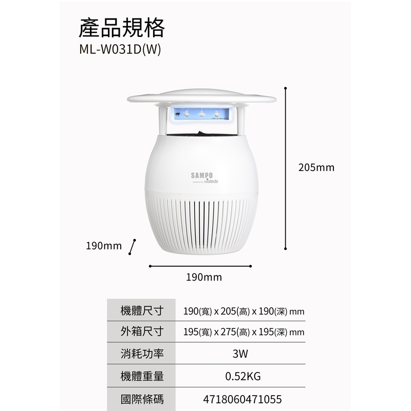 聲寶SAMPO 強效UV捕蚊燈 ML-W031D-W