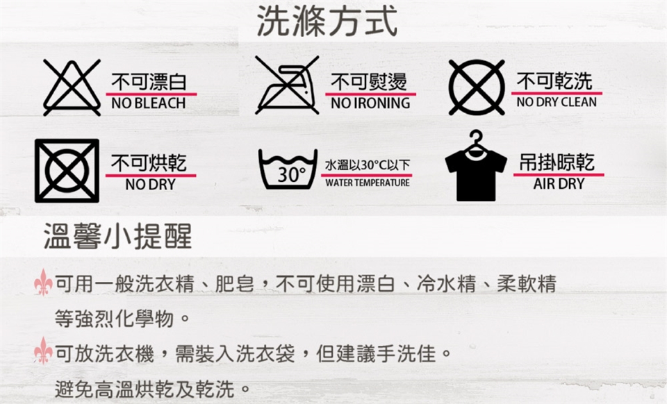 2.勿漂白3.勿熨燙4.勿乾洗5.勿烘乾6.勿使用柔軟劑