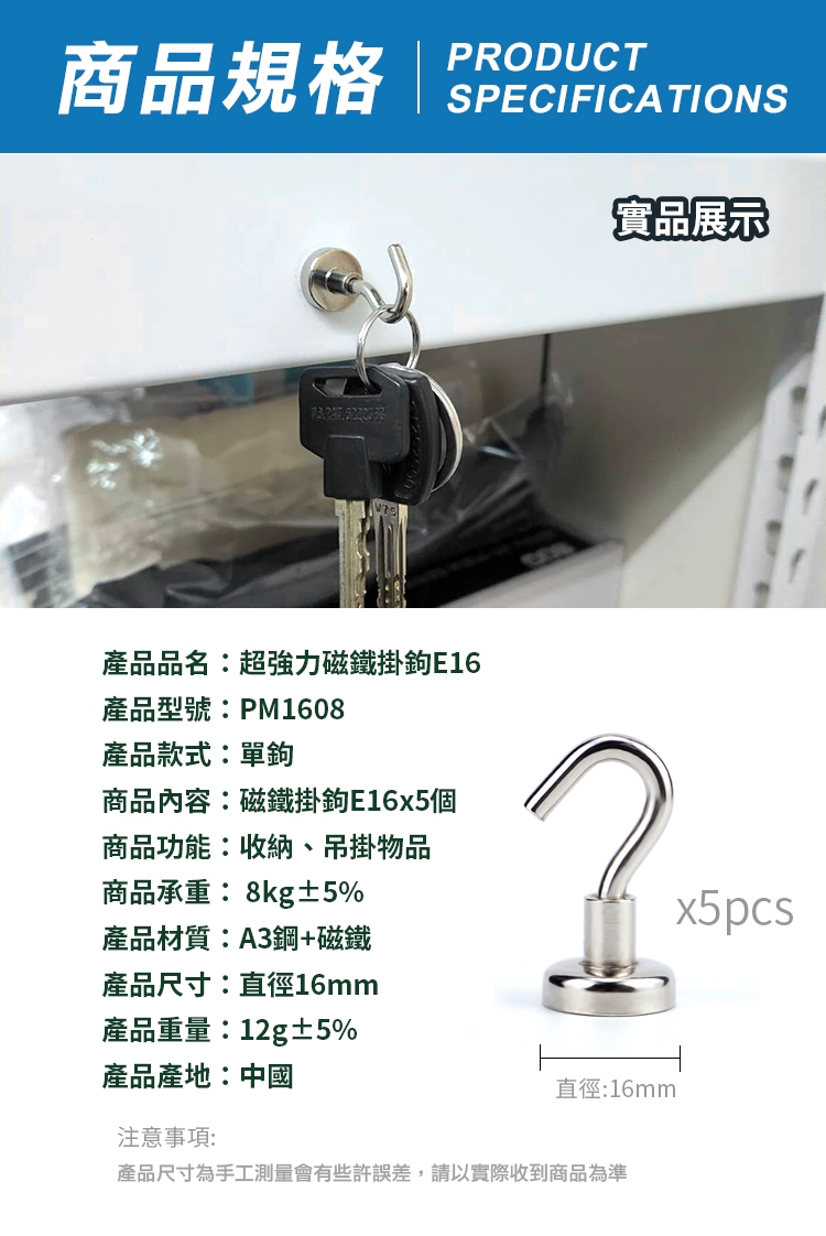 商品內容:磁鐵掛鉤E16、20、25、32、36各一