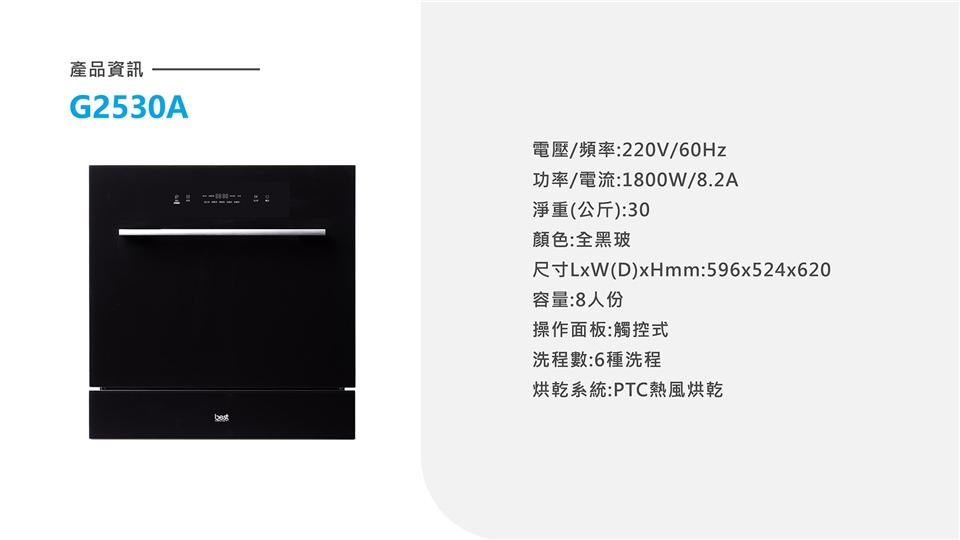 【貝斯特best GDM】獨立熱風烘乾嵌入式8人份除氯洗碗機G-2530B