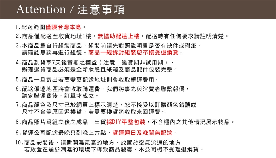 7. 商品照片為組立後之成品,出貨採DIY平整包裝,不含櫃內之其它情境展示物品。