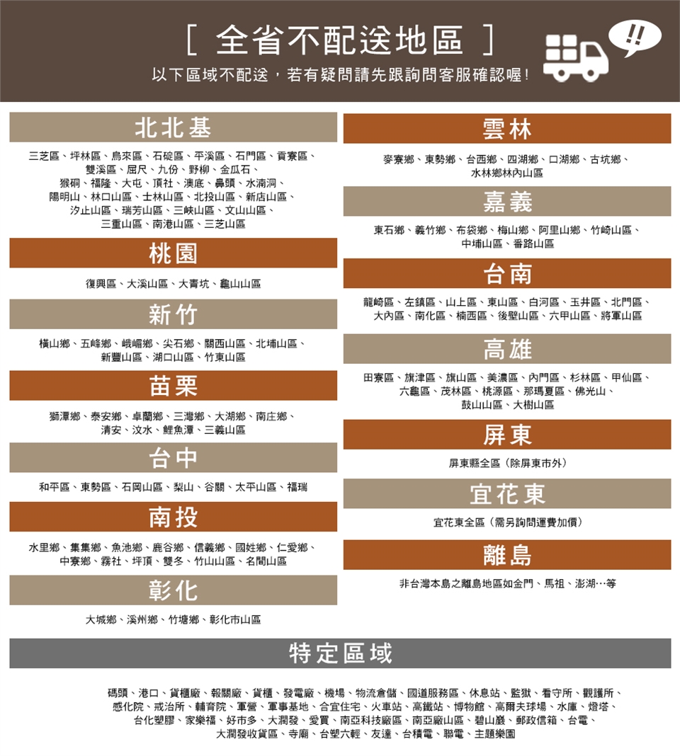 1. 配送範圍僅限台灣本島,離島無配送。