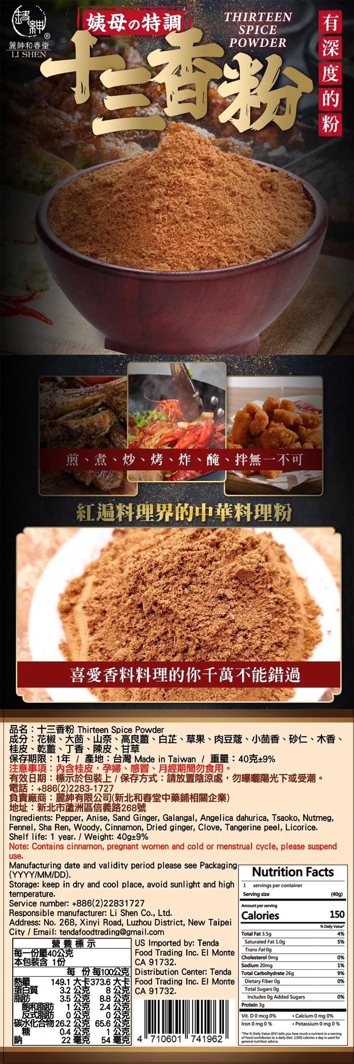 成分:花椒、大茴、山奈、高良薑、白芷、草果、肉豆蔻、小茴香、砂仁、木香、桂皮、乾薑、丁香、陳皮、甘草