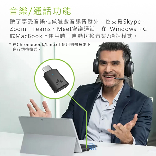 除了享受音樂或做遊戲音訊傳輸外,也支援Skype、Zoom、Teams、Meet會議通話,在 Windows PC或MacBook上使用時可自動切換音樂/通話模式;在Chromebook/Linux上使用則需按兩下進行切換模式。
