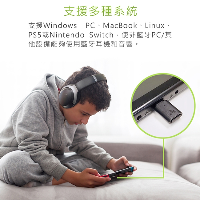 支援Windows PC、MacBook、Linux、PS5或Nintendo Switch,使非藍牙PC/其他設備能夠使用藍牙耳機和音響。