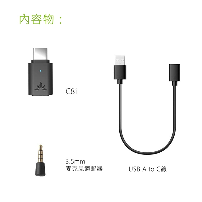 1. 產品僅包含Avantree C81藍牙發射器*1、3.5mm麥克風適配器*1、USB A to C線*1,Switch/耳機/電腦等僅圖片示意並無包含在內。