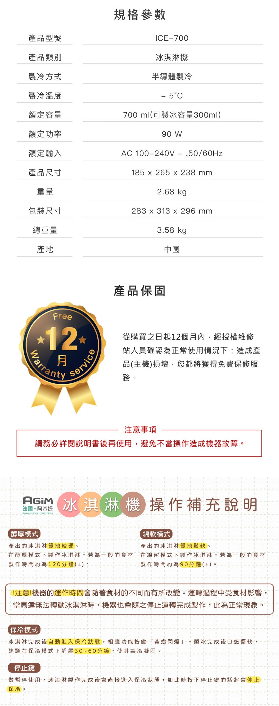 工作時長(空載) 硬雪糕:120 分鐘,軟雪糕:90分鐘