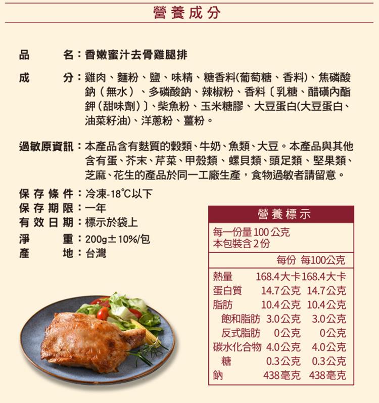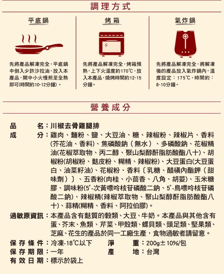 【成分】雞肉、麵粉、D-山梨醇液70%、大豆油、鹽、糖、醬油、味精、多磷酸鈉、胡椒粉、肉精粉(雞肉、鹽、糊精、糖、葡萄糖、5‘-次黃嘌呤核苷磷酸二鈉、5‘-鳥嘌呤核苷磷酸二鈉、胺基乙酸、DL-胺基丙酸、琥珀酸二鈉)、辣椒粉、胡椒粉(胡椒粉、麩皮粉、糊精、辣椒粉)、糖香料(葡萄糖、香料)、甘草酸鈉(甜味劑)、洋蔥粉。