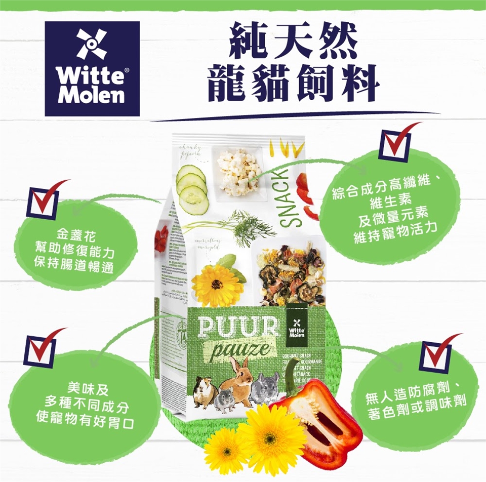 主成份:穀物(3%爆米花玉米)、蔬菜(2%時蘿,2%黃瓜片,0.5%紅甜椒)、植物來源衍生物(3%金盞花)
