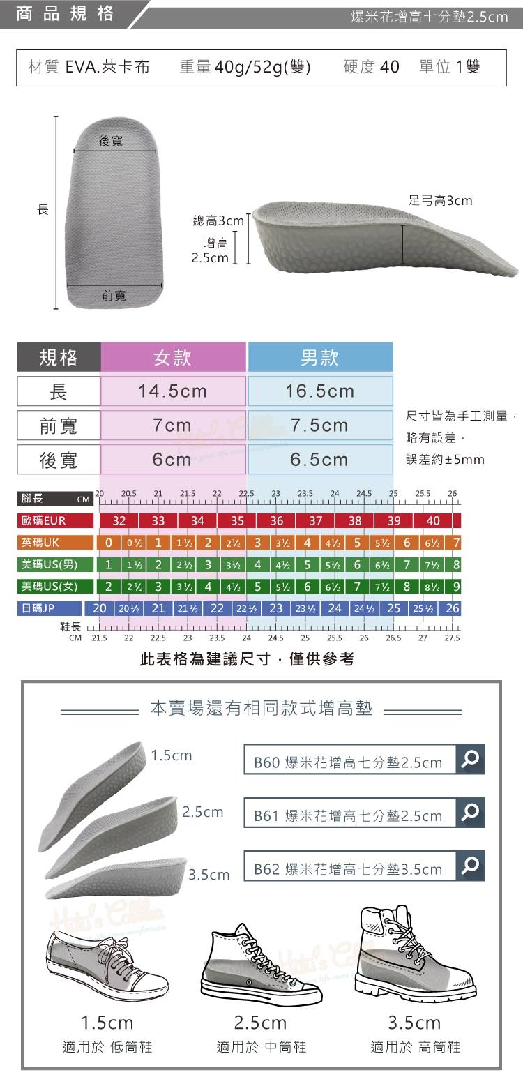 B62 爆米花增高七分墊3.5cm