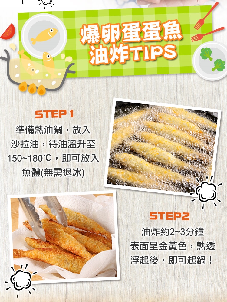 本產品未經煮熟、食用時需加熱調理。油炸油溫預熱150-180度c,煎炸約4-6分鐘,至熟即可食用