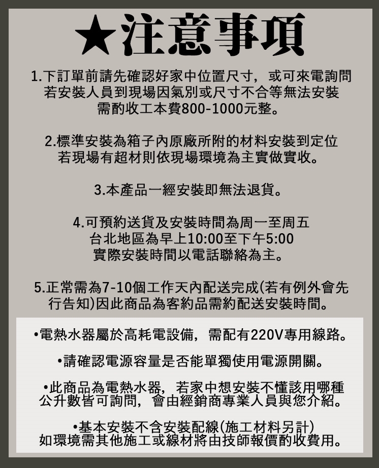 •下訂單前請先確認好家中位置尺寸,或可來電詢問,若安裝人員到現場因氣別或尺寸不合無法安裝,則需酌收工本費800-1000元整。