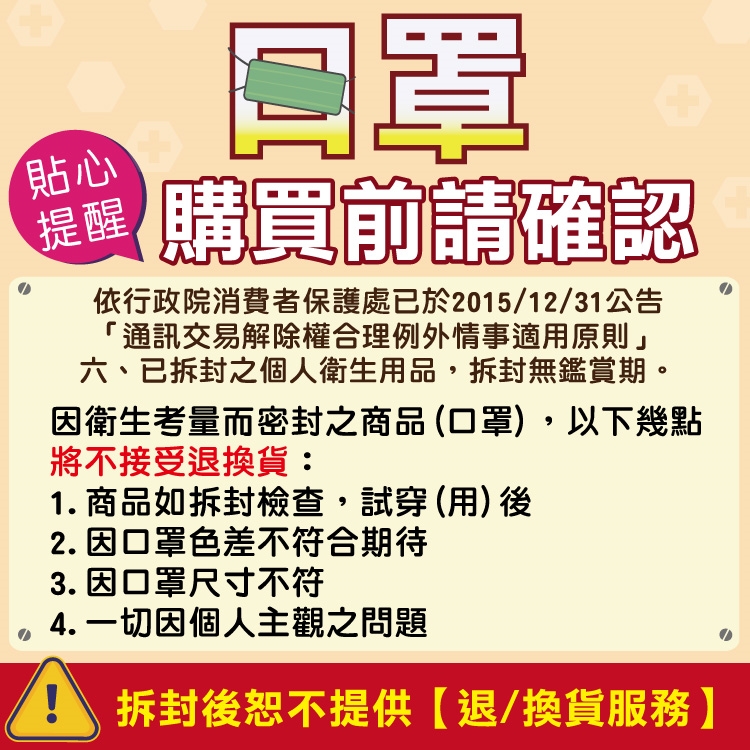 ※口罩商品屬於個人衛生用品性質具備消保法第十九條所定之合理例外情事,經拆封後無7日猶豫期,如欲退貨請勿拆封※