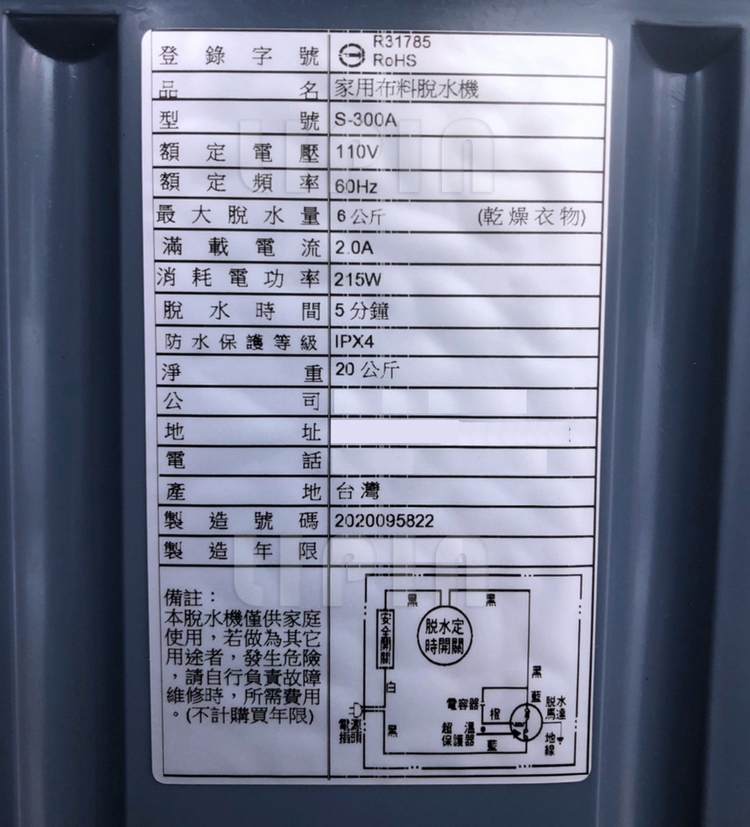 ◎本脫水機僅供家庭脫乾衣物使用,不得使用在非衣物以外之物品(如脫洗菜類,檳榔等)若作為其他用途者,請自行負責故障維修之費用(如馬達不當使用,或連續過量使用者,需提供維修費用)