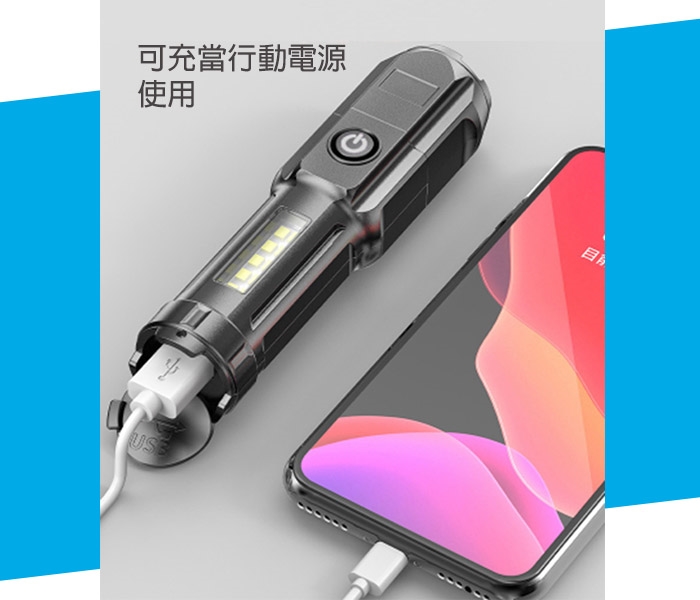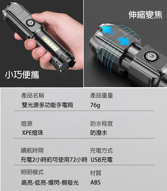 按鍵開關:四段切換:高亮-低亮-爆閃-側發光