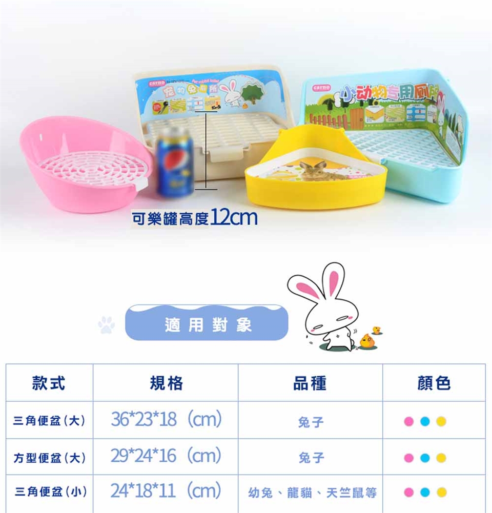 底盆傾斜設計能夠輕易將小動物的排泄物自然流向前端,讓廁盆內的墊料能完全吸收排泄物,不會造成浪費墊材,而其細小的踏板尺寸亦是專為兔寶寶量身而設計。