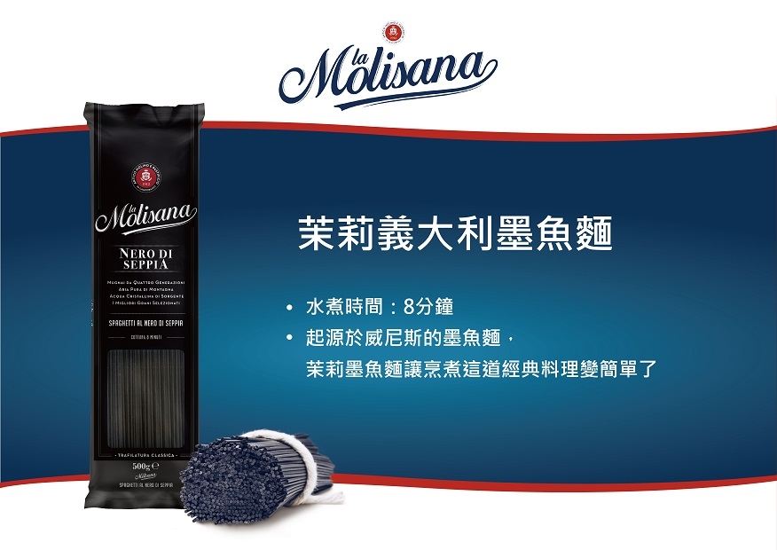 .茉莉義大利墨魚麵:*過敏源資訊:本產品含有麩質的穀類及頭足類,不適合其過敏體質者食用。*本產品生產製程廠房,其設備或生產管線有處理大豆。