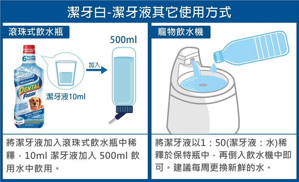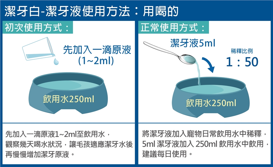 建議每日加入日常飲用水中稀釋,5ml 潔牙液加入 250ml 飲用水中飲用,稀釋比例 1:50。