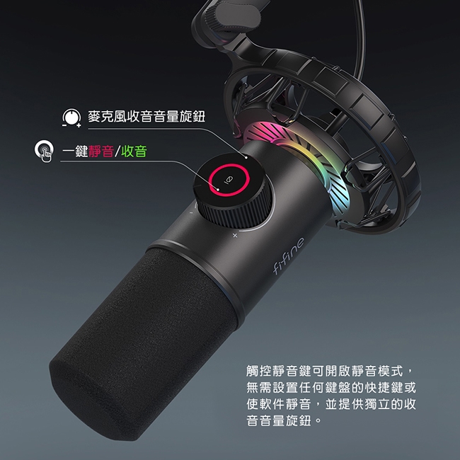 觸控靜音一鍵靜音及收音音量鈕,適用於直播、實況的時候能隨時調整音量及靜音。