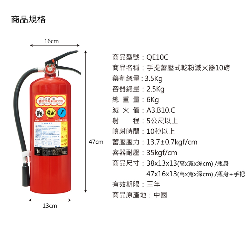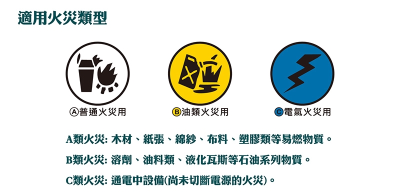.A類火災/ B類火災/C類火災皆可用,適用滅火材質如下: