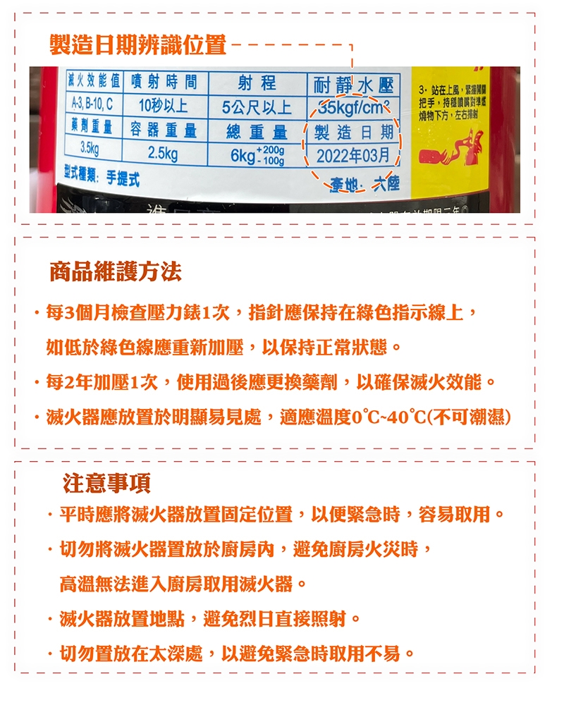 .每二年加壓一次,使用過後應換裝藥劑,以確保滅火效能。