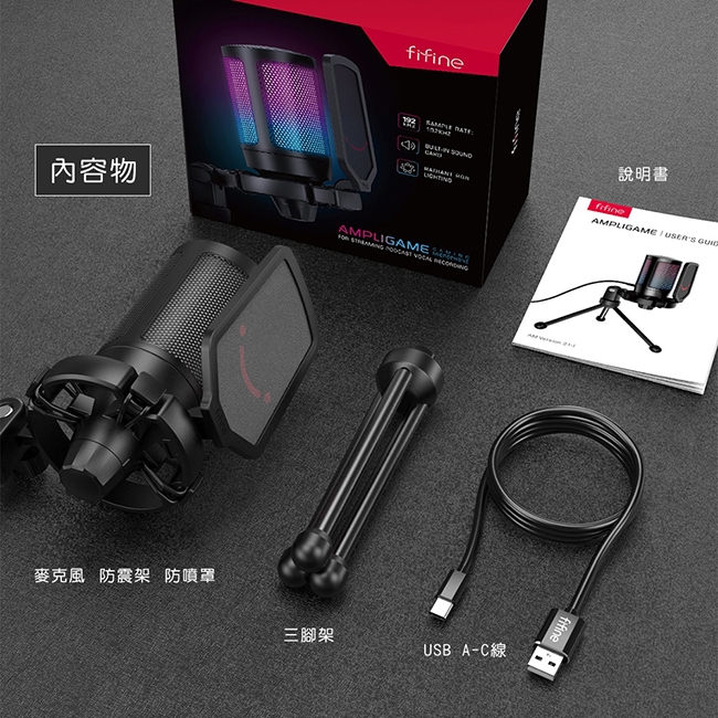 1. 產品內含A6V麥克風*1、防震架*1、防噴罩*1、三腳架*1、傳輸線*1、說明書*1。