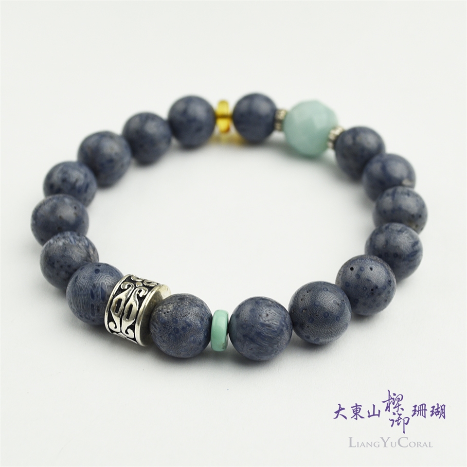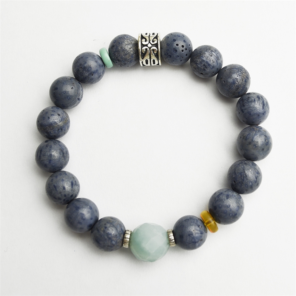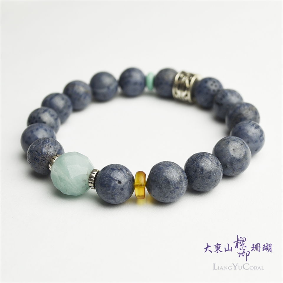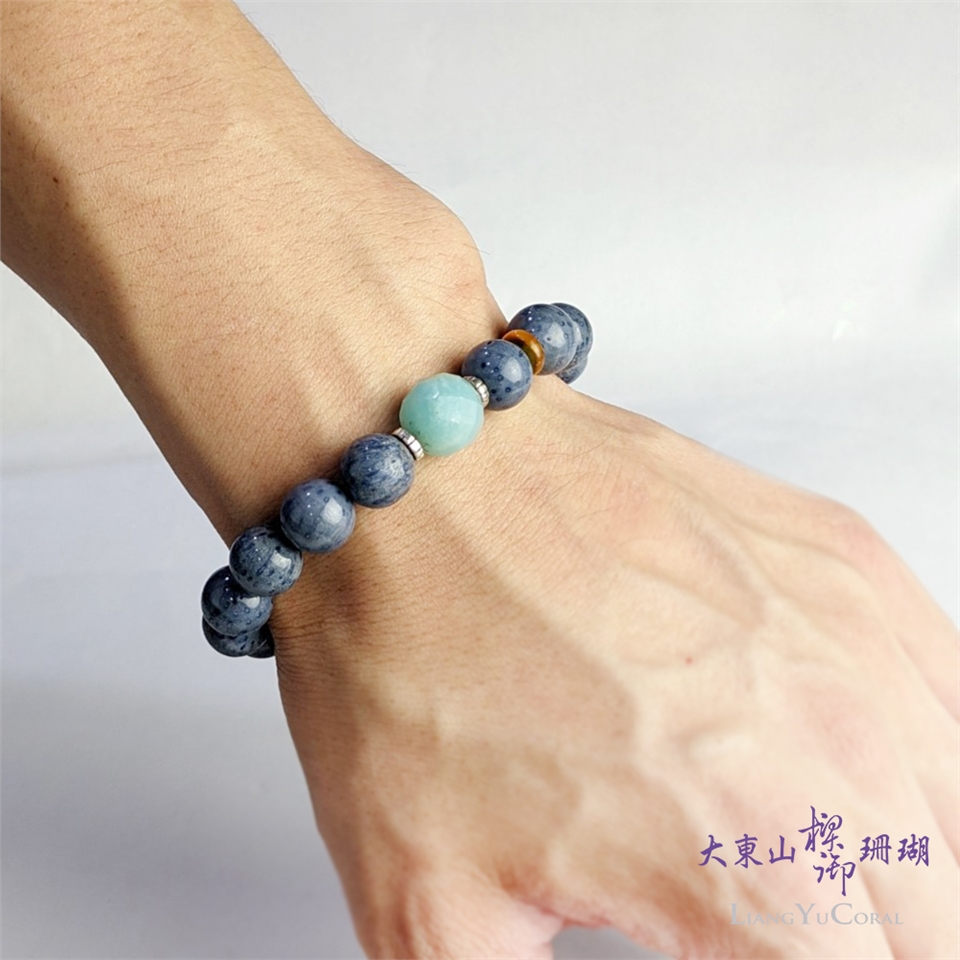 品名:藍珊瑚綴亞馬孫石彈力線手鍊