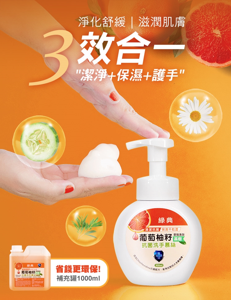 葡萄柚籽茶樹保濕抗菌洗手慕斯泡泡洗手乳300ml x 2瓶(台灣GMP工廠製造)