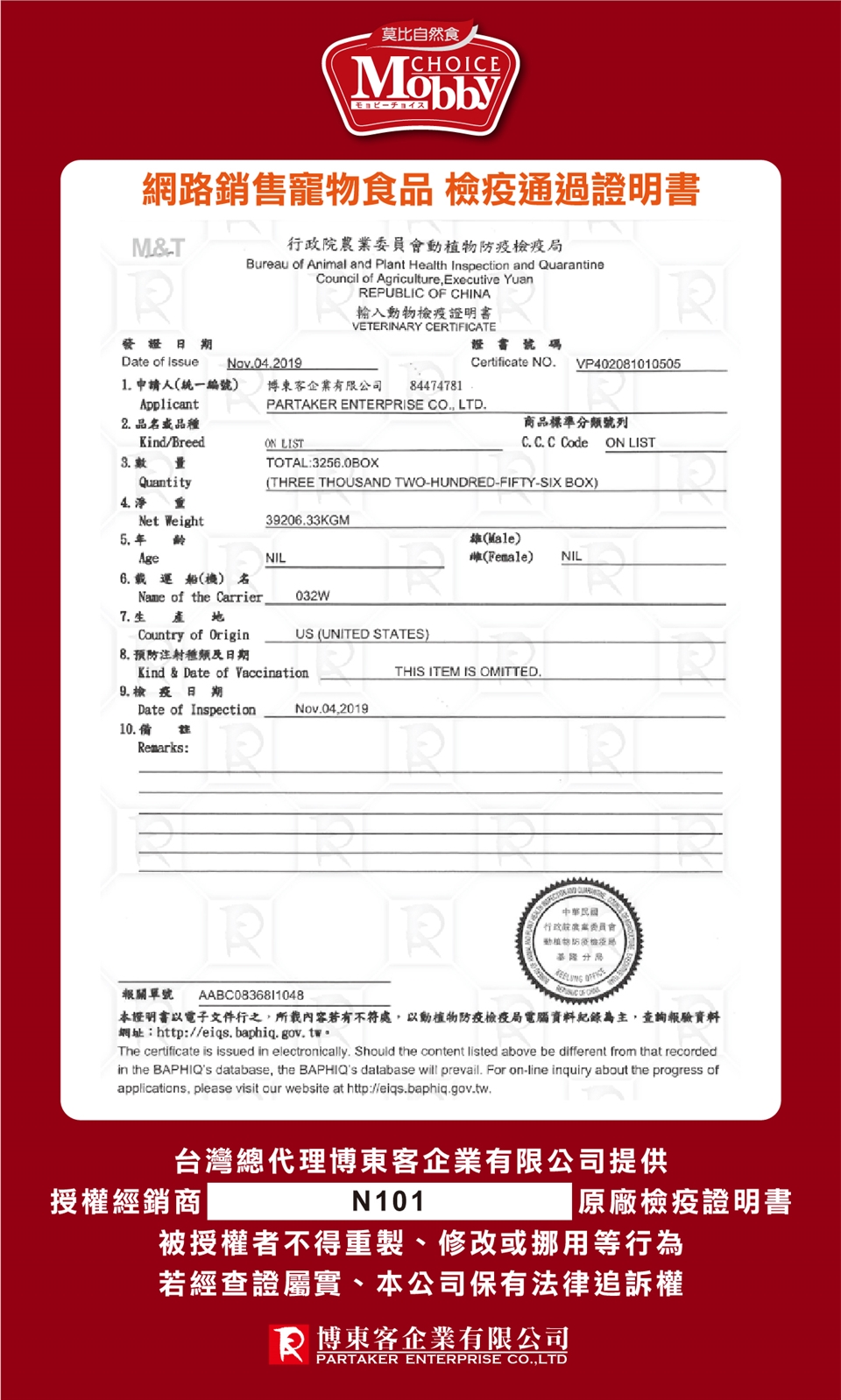 蛋白質35%、油脂10%、灰質6.0%、纖維質8%、水分10%、牛磺酸0.1%、Omega6亞麻油酸1.7%、Omega3 次亞麻油酸0.3%、維生素A 15000 IU/kg、維生素D 300/IU/kg、維生素E 300 IU/kg、銅 20mg/kg、硒0.45 mg/kg、葡萄糖胺1200mg/kg、軟骨膠硫酸鹽100mg/kg鈉0.8%、磷0.7%、鎂0.1%