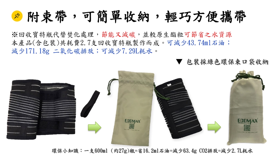 本產品(含包裝)共耗費2.7支回收寶特瓶製作而成。可減少43.74ml石油;
