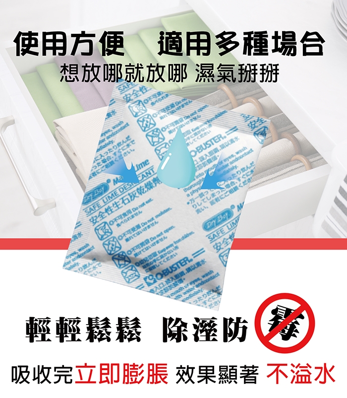 「安全生石灰乾燥劑」遇到水不放熱、無腐蝕性,安全性大幅提升。
