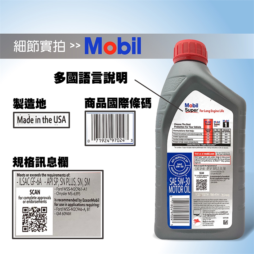 Mobil Super 5W30 由高品質基礎油和現代性能添加劑配製而成,有助於延長發動機壽命並保護關鍵發動機部件在長達 5,000 英里或車輛 OEM 建議的換油間隔(以較長者為準)中免受與潤滑油相關的故障.* 它是一種合成混合機油。