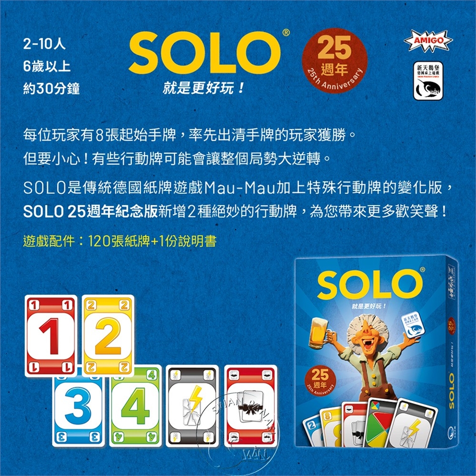 SOLO是傳統德國紙牌遊戲Mau-Mau加上特殊行動牌的變化版,SOLO25週年紀念版新增2種絕妙的行動牌,為您帶來更多歡笑聲!