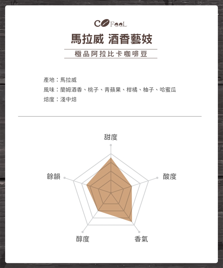 品名:CoFeel 凱飛鮮烘豆馬拉威厭氧酒香藝妓淺中焙阿拉比卡咖啡豆半磅