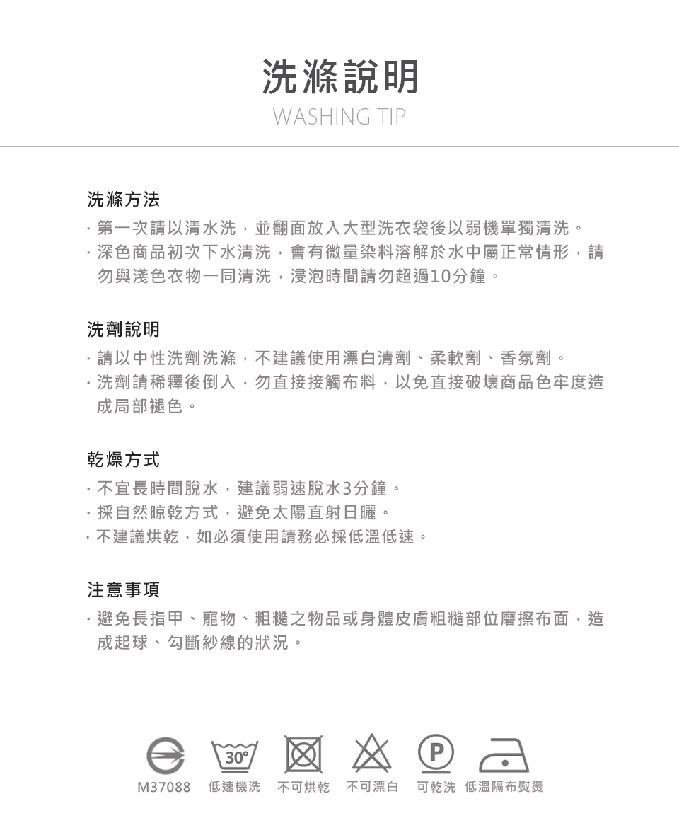 可水洗(第一次請清洗水)/不可烘乾/不可漂白/洗劑勿直接接觸布料/勿使用強力漂白清潔劑/浸泡時間請勿超過10分鐘/請翻面放入大型洗衣袋後再以弱機單獨清洗