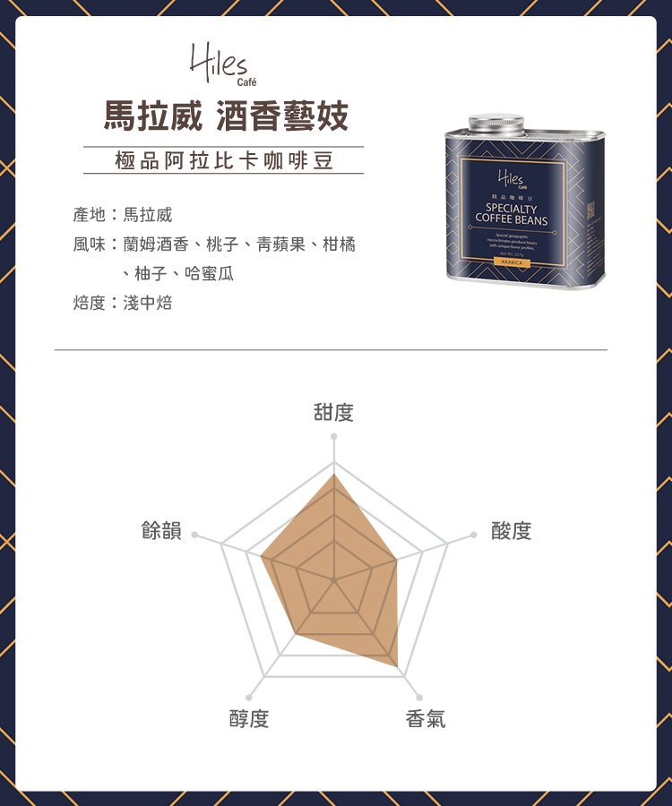 品名:Hiles 馬拉威厭氧酒香藝妓淺中焙極品阿拉比卡咖啡豆氣閥式豆罐裝半磅