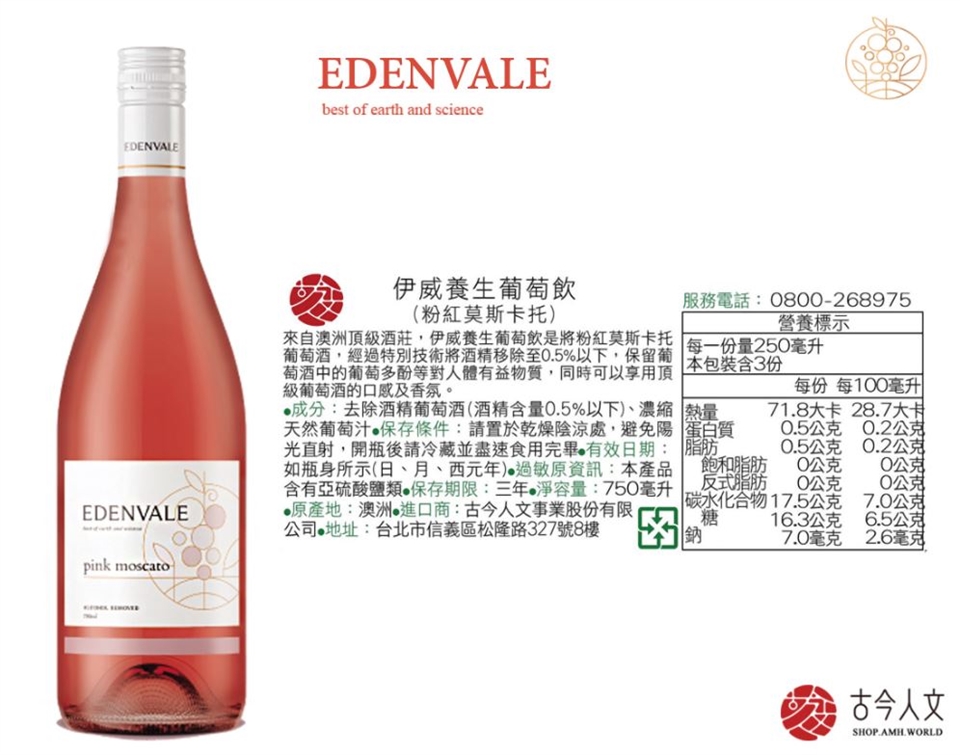 採用澳大利亞東南澳最優質的葡萄釀造而成,釀造過程中採用了先進的脫醇技術去除酒精,同時保留了有益健康的抗氧化物質以及維生素。