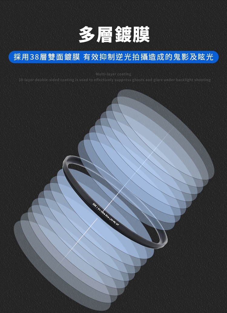 ●鏡片兩側各有19層鍍膜(即共38層),可有效減少耀光鬼影。